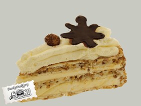 Hazelnootschuim met luchtige creme, krokante hazelnoten aan de zijkant, royaal afgewerkt met slagroom en een paar chocoladehazelnoten.